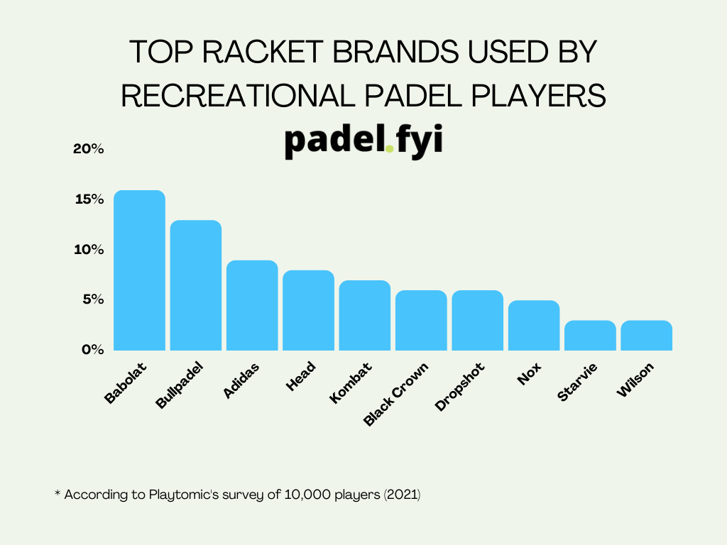 Babolat возглавил список с 16% игроков в падель, играющих с ракетками Babolat . Bullpadel и Adidas заняли второе и третье места с 13% и 9% соответственно. Рынок очень диверсифицирован, и наблюдатели за паделом задаются вопросом, будет ли он консолидироваться по мере роста.