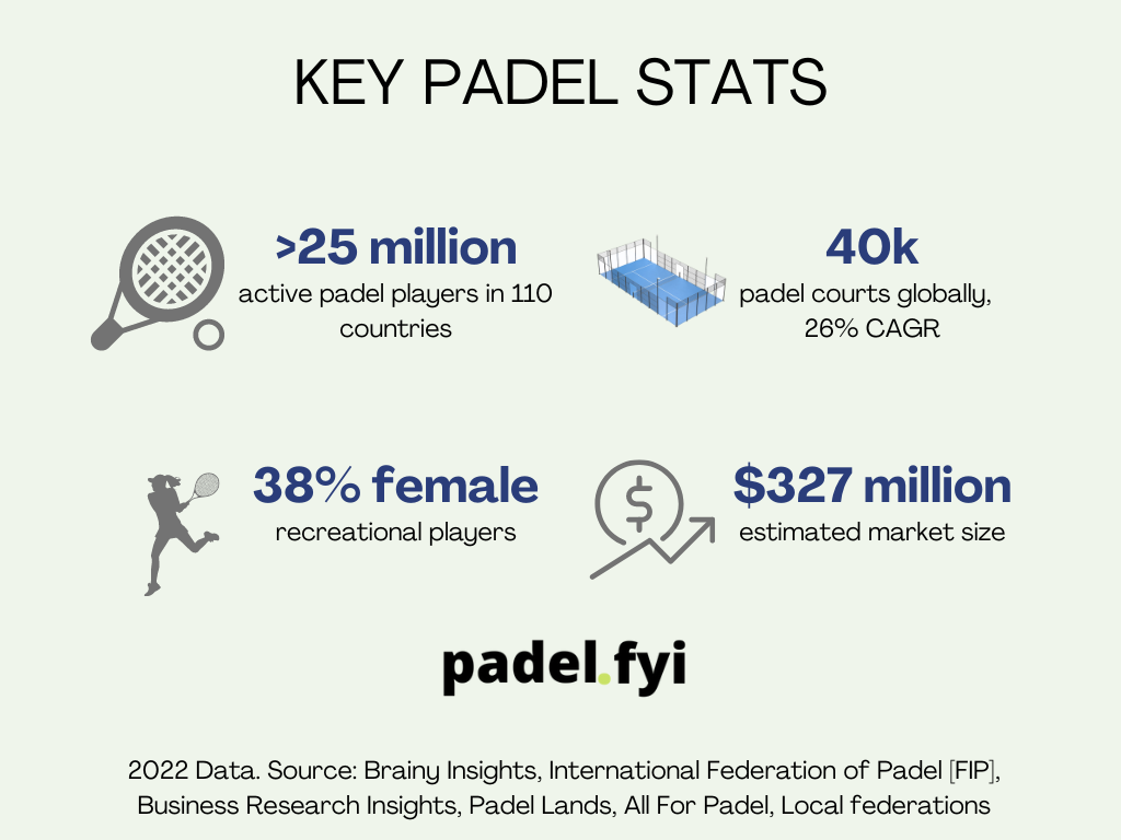 Бизнес по производству падл-тенниса процветает. Объем рынка падл-тенниса в настоящее время оценивается в 327 миллионов долларов США в 2022 году и, по прогнозам, будет расти на 9,6% до 2027 года (Brainy Insights).