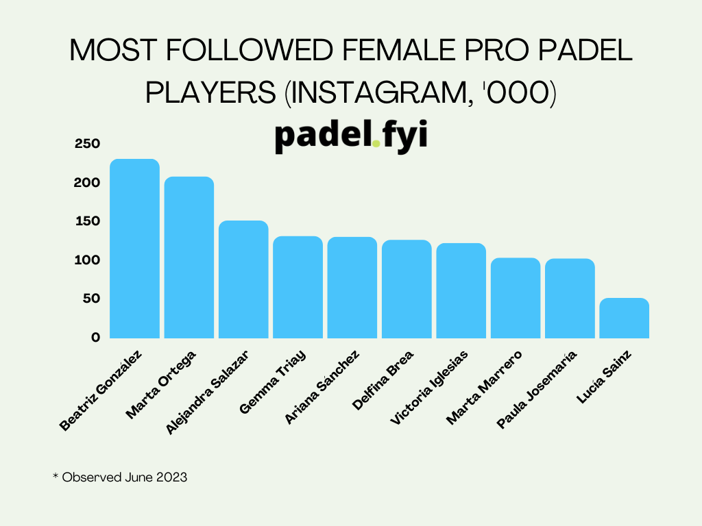 Беатрис Гонсалес (232 тыс.), Марта Ортега (209 тыс.) и Алехандра Салазар (152 тыс.) возглавляют список самых популярных женщин-игроков в падель в Instagram.